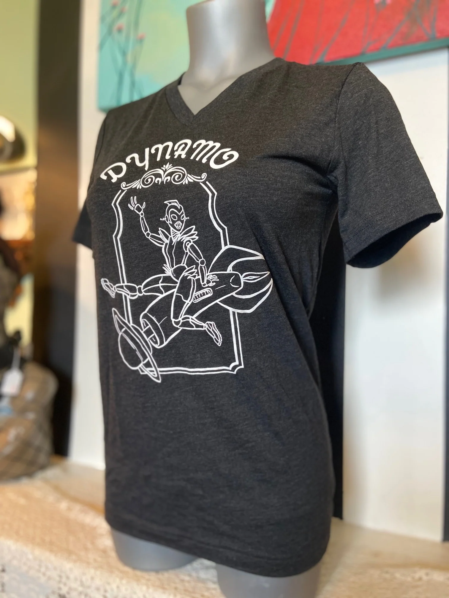 Unisex v-neck short sleeve T-shirt in black heather. Features Dynamo's robot logo in white.
