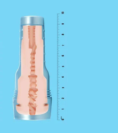 Light skin tone sleeve in a blue case. Fleshlights are made of body-safe elastomer in a hard plastic case, with removable caps on both ends. Adjust suction by twisting the bottom cap. Use with water-based lube. To clean, remove sleeve and run water through it.