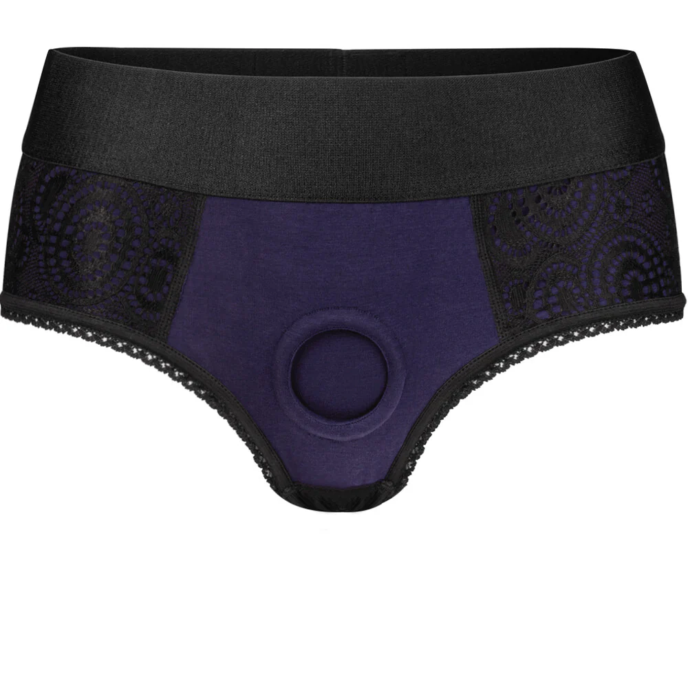 Here by popular demand, the RodeoH is an iconic underwear-style harness brand that is beloved by many. Not only do they make strapping on a snap (wear them as underwear til you're ready to play — no fooling around with changing clothes or adjusting buckles), they’re damn stylish. Designed to be feminine and strong, this beautiful mid-rise panty has a cotton front and side panels of our signature "O" lace over a soft cotton. The satin elasticated waistband provides significant support while the crotchless gusset and open back make for "easy access."
