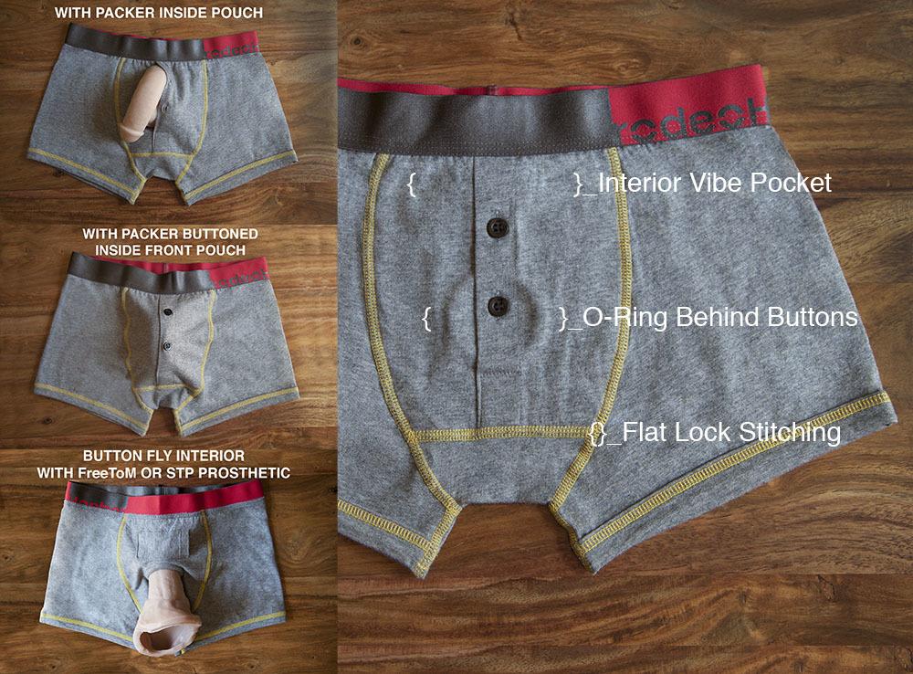 Here by popular demand, the RodeoH is an iconic underwear-style harness brand that is beloved by many. Not only do these boxer briefs make strapping on a snap (wear them as underwear til you're ready to play — no fooling around with changing clothes or adjusting buckles), they’re damn stylish. The Button Fly Boxer Harness has a discreet O-ring hidden behind the button fly front. This versatile style can be used as a harness with single or double-ended dildos and/or as packing/STP underwear! RodeoH’s soft, comfortable boxers are made of 95% cotton and 5% elastene, with a 1.5″ waistband. Rodeoh harnesses are paired with toys that are between 5″-6″ length x 1.5″-1.875″ width. Machine wash cold, tumble dry low.